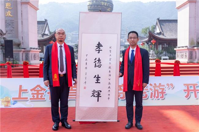 2024年10月11日重阳佳节之际,上金谷首届“亲老游”公益盛典开游仪式在宁波宁海召开,原国家旅游局党组副书记、副局长王志发、民建中央委员侯惠荣等领导出席,国家民政部原副部长李宝库题写“孝德生辉” 由郭俊昌秘书长代为赠送。上金谷景区积极举办“亲老游”公益活动,让民生情怀和幸福产业切实惠及老年群体,用实际行动弘扬中华民族敬老爱老的传统美德。